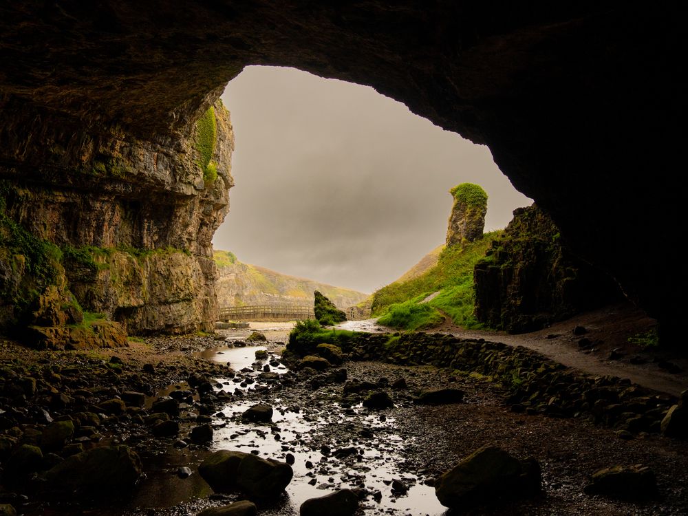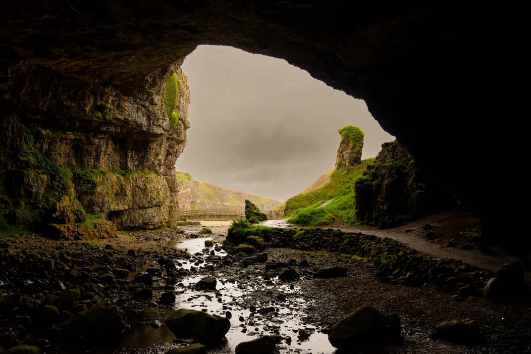 Smoo Cave along the North Coast 500 gives a dramatic view of a fresh water stream snaking it's way back to the ocean.