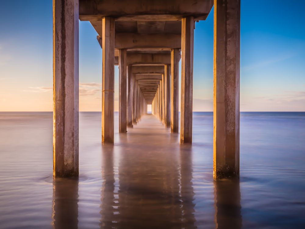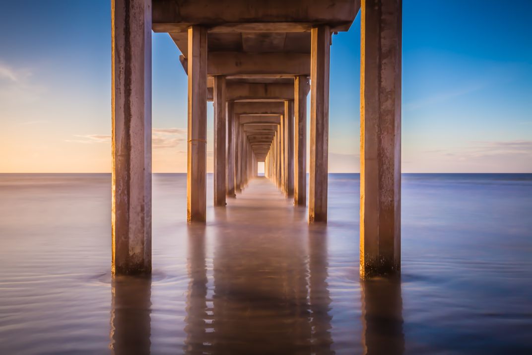 Sunset from the underside of Scripps Pier in La Jolla, California outside of San Diego.