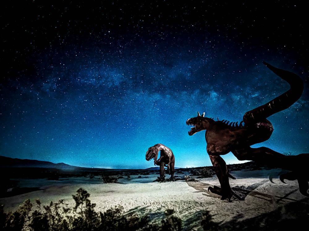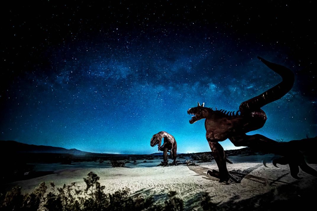 Two life-sized sculptures by Ricardo Braceda confront one another in the desert much as they would have done millions of years ago.