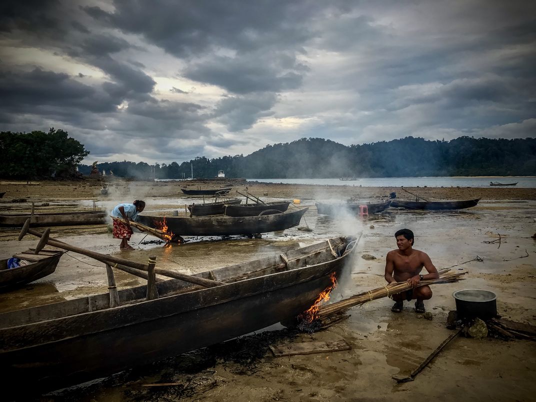 The Moken people of Myanmar, in the Andaman Sea, are mostly giving up their life on the water, but one group was burning their boats in a traditional preparation for the sea. The women in particular use them to set nets close to shore.