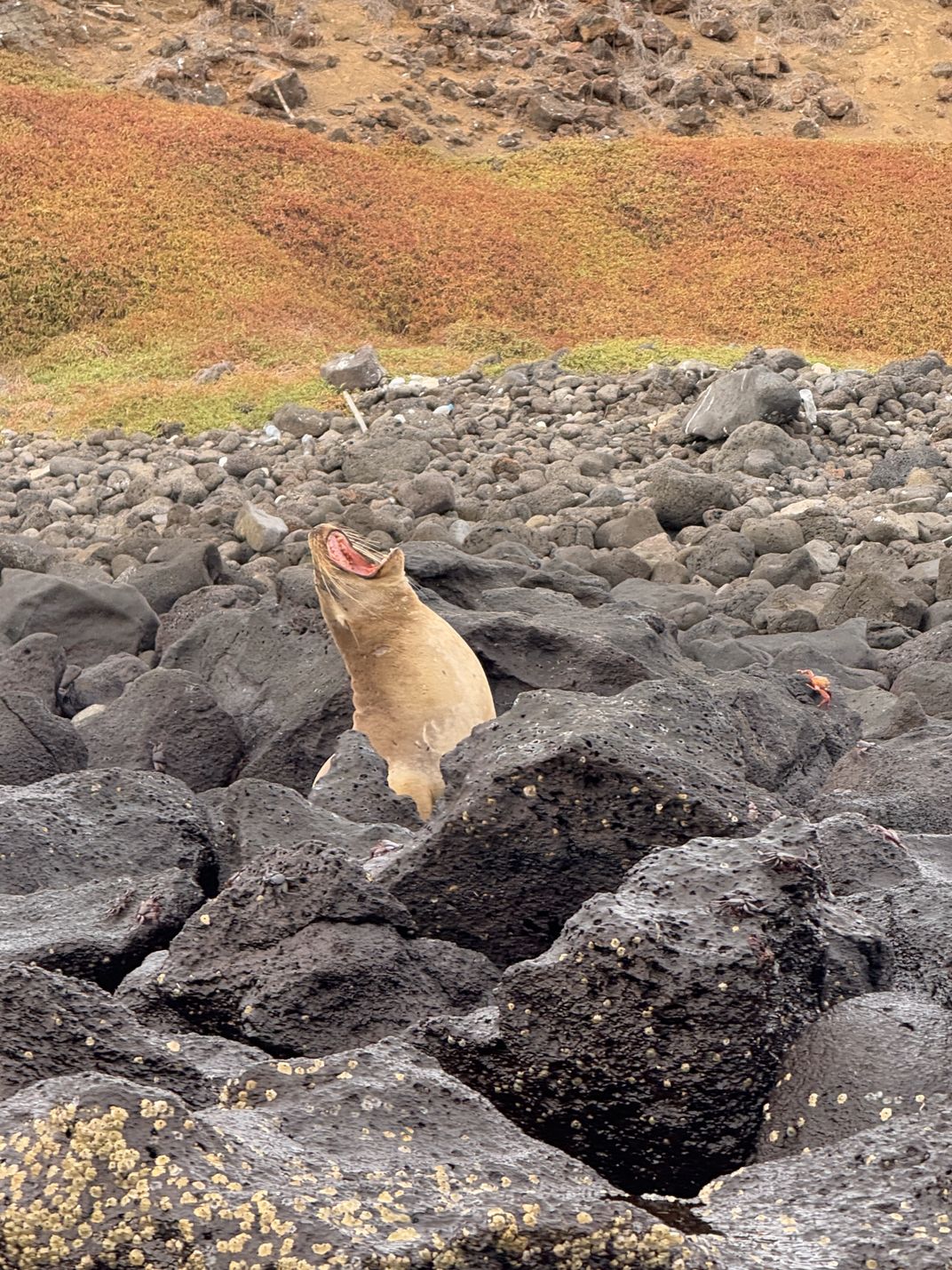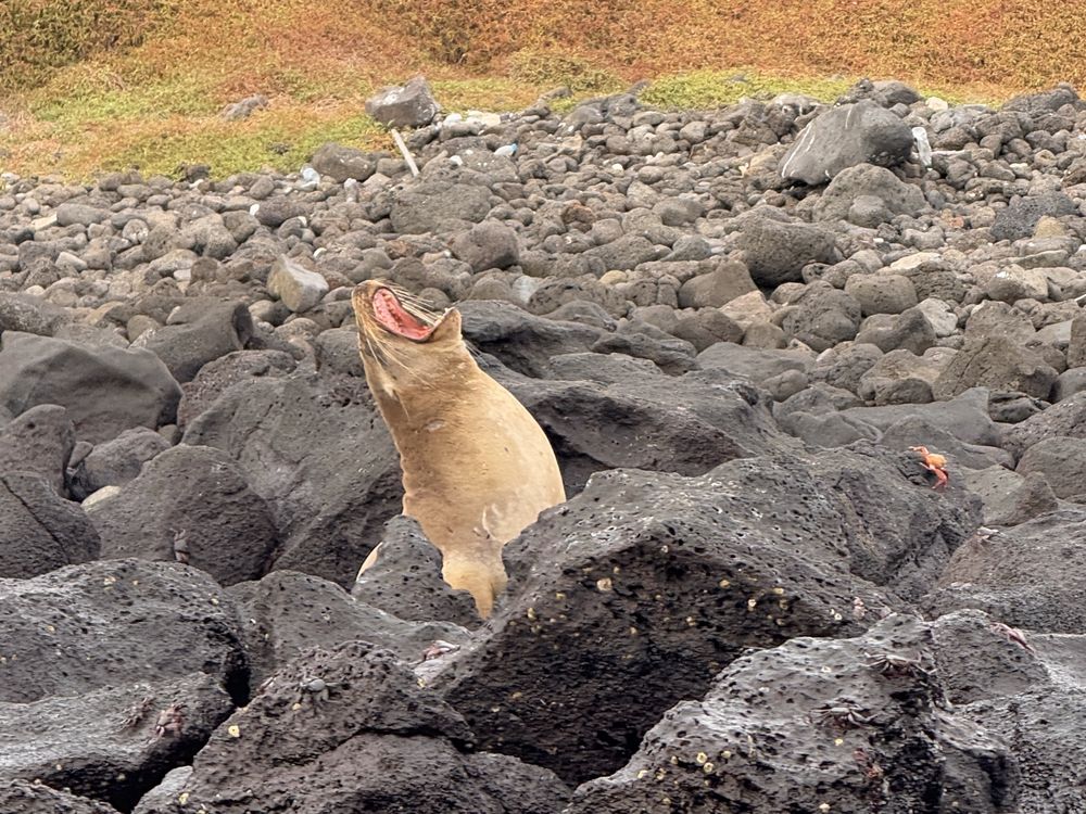 This photo shows a sea lion, making an evening yawn, amongst the seashore rocks of Isla Isla Seymour Norte, Galapagos.