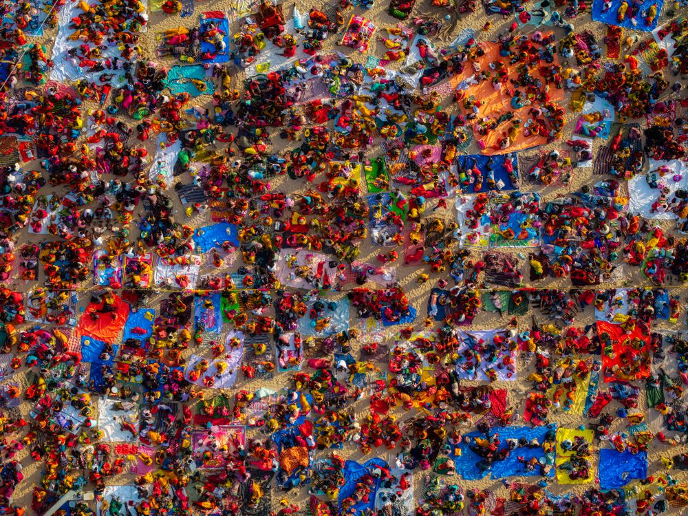 Seen from above, thousands of devotees gather on the sandy riverbank, their colorful saris and prayer cloths forming a living mosaic of faith. Each square of fabric marks a family, a prayer, a story — woven together into a vast tapestry of devotion. In this aerial view, individuality dissolves into collective purpose, echoing the rhythm of India’s spiritual heartbeat that binds millions in shared belief.
