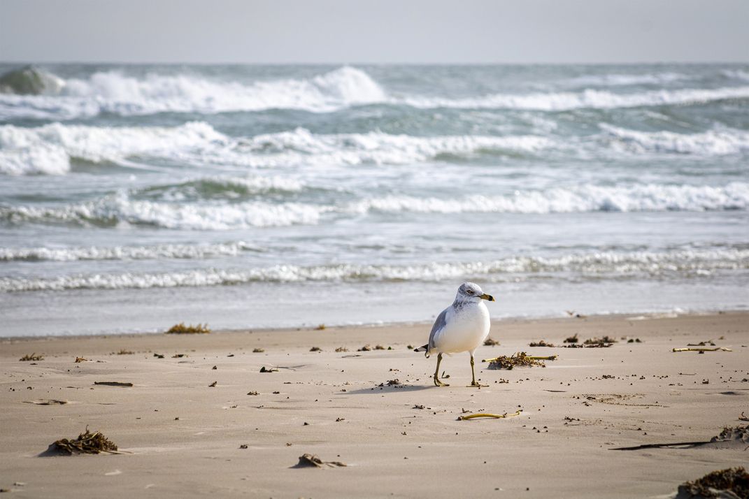 A Ring-billed Gull walks along the sand of Mustang Island, Texas, surrounded by scattered seaweed and shells. The waves of the Gulf provide a layered background, capturing the natural activity of the shoreline on a sunny afternoon.
