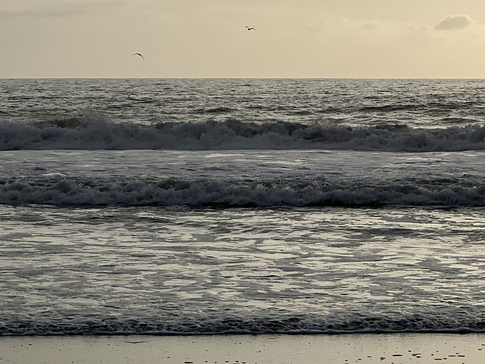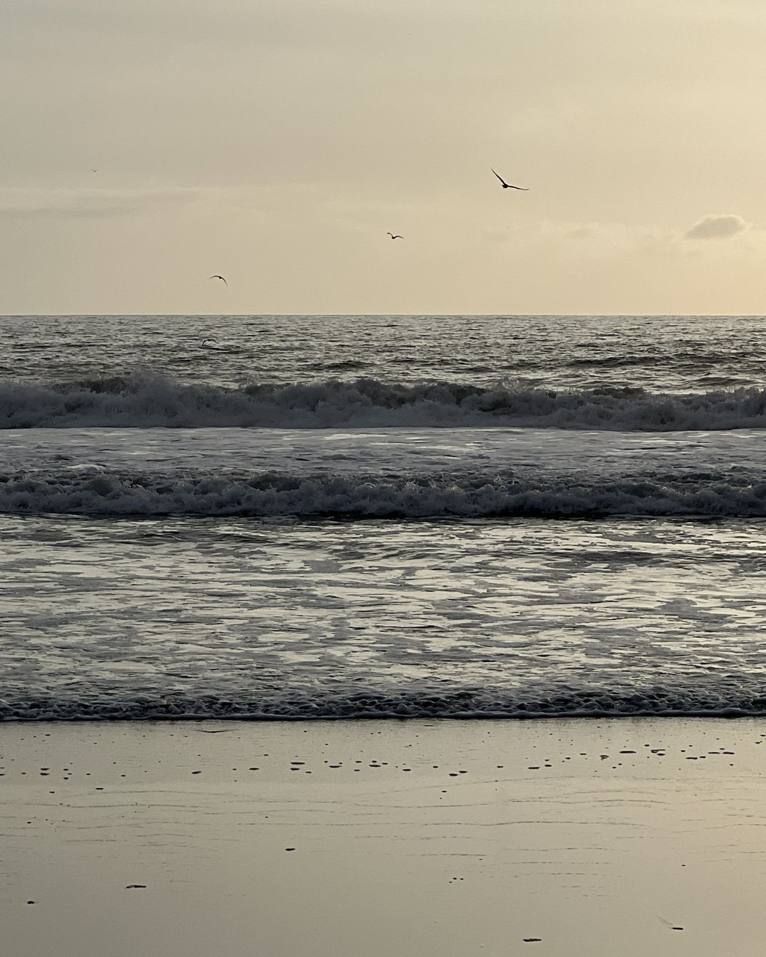 Seagulls fly peacefully over a serene Pacific Ocean on a tonal Spring evening.