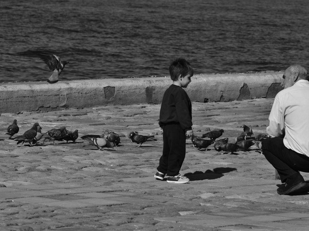 This photograph was taken along the waterfront in Konak, İzmir. A child and an older man share a quiet moment while watching pigeons gather around them on the stone pavement. The black-and-white composition emphasizes the textures of the ground, the movement of the birds, and the gentle connection between the two figures. The open space of the sea behind them adds a sense of calm, contrasting with the lively activity in the foreground. The image captures a simple, everyday scene that reflects the rhythm of life along the Aegean coast, where generations often come together in public spaces.