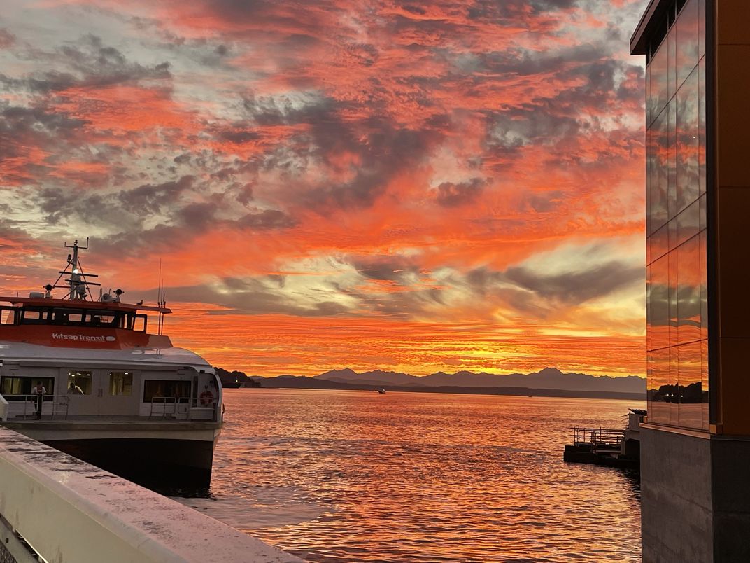 While on vacation, I took this photo while waiting to board the water taxi to West Seattle. I loved the color in the sky. The locals seemed equally enthralled with the sunset. An employee at the taxi dock invited me to stand on the dock when he saw me taking pictures and said he’d never seen a sunset as vivid as this. I had never seen anything like it but it seemed to be a rare treat for everyone that night.