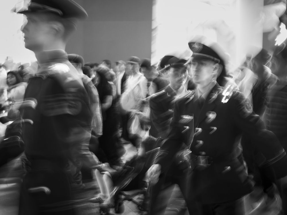 During a fireworks show in Shanghai, security officers patrol historic Nanjing Road.