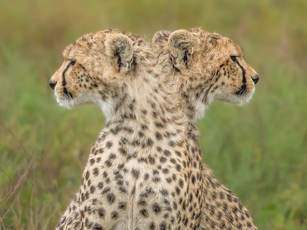 While their mother scanned the horizon for possible prey, I noticed these very hungry, endangered Cheetah cubs leaning against one another appearing to be one cub with two heads. The moment was very brief as the cubs drew solace from one another.