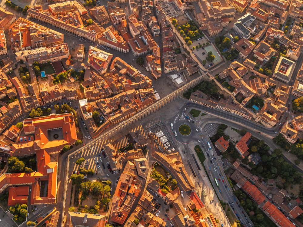 Evening light falls on the old town of Segovia as the Roman aqueduct cuts across the city, its arches casting long shadows on the square below. Photographed from a small aircraft, the view shows how the ancient stone structure is still woven into the daily life and streets of a modern Spanish city.