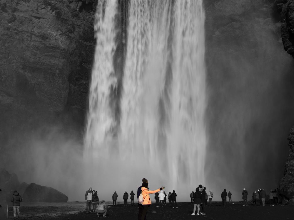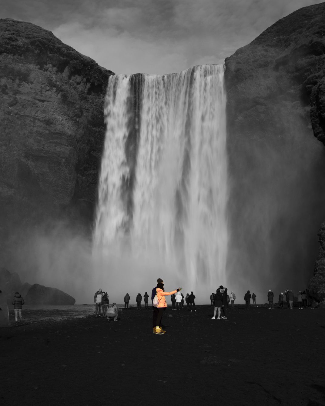 The powerful waterfall Skogafoss along the Ring Road in Iceland is one of the few you can walk right up to. Visitors try to take selfies there all the time.