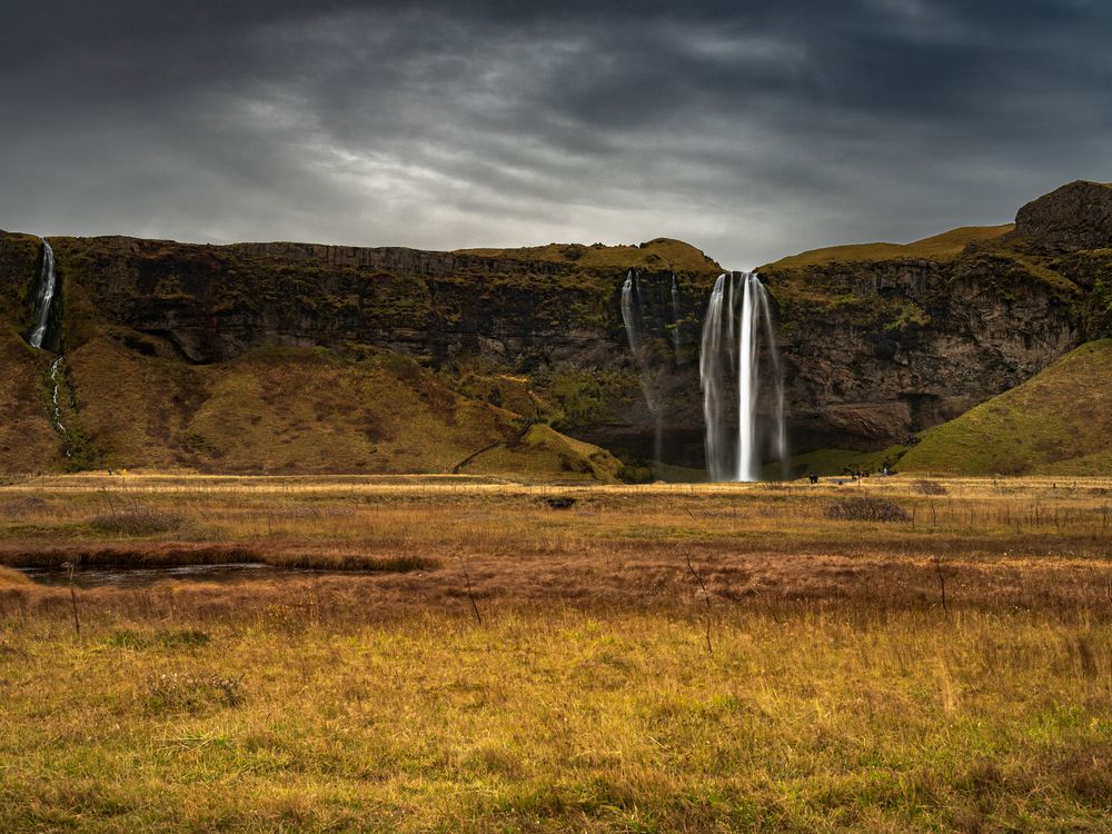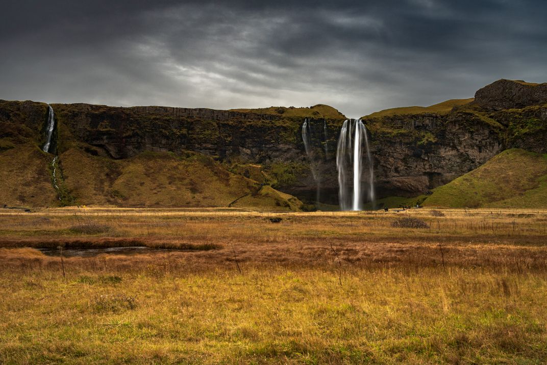 A panoramic of the Seljalandsfoss waterfall in southern Iceland.
