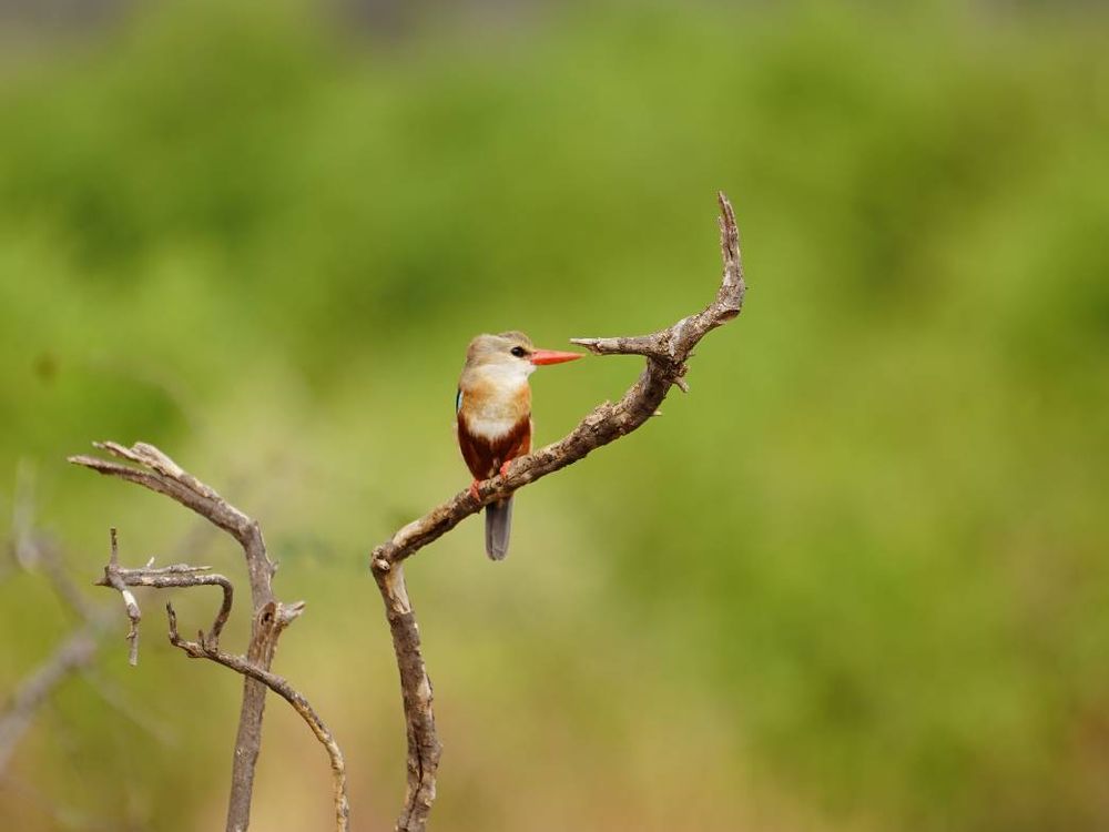 A tiny kingfisher perches alone on a bare branch, surrounded by a sea of green. Its stillness turns the open air into a stage for color and poise.
