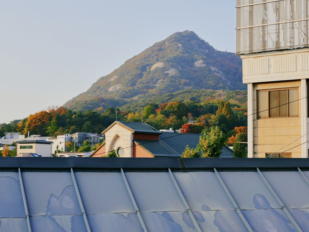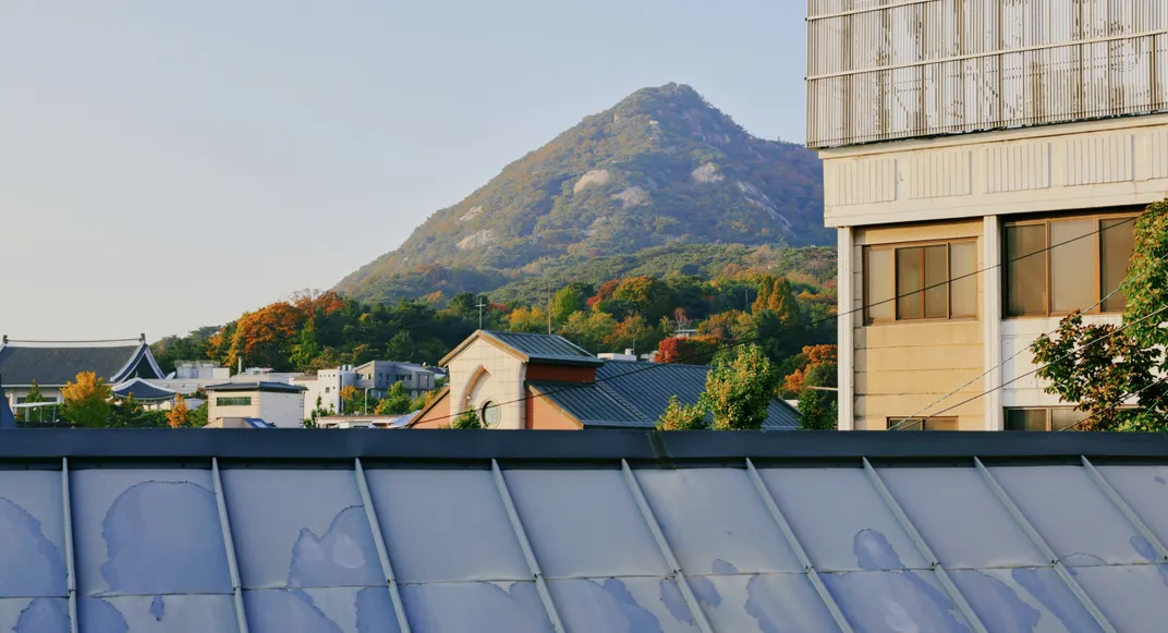 Taken during an autumn walk in Bukchon, Seoul's traditional hanok district, this layered composition captures the city's distinctive character—where traditional tiled roofs, historic architecture, and modern buildings nestle together beneath Seoul's guardian mountains. The autumn foliage adds warmth to this study of urban coexistence, illustrating how Seoul harmoniously blends centuries of history with contemporary life.