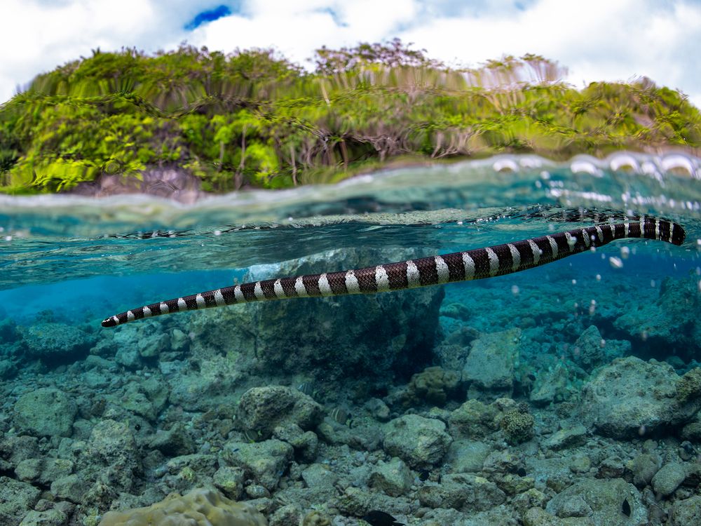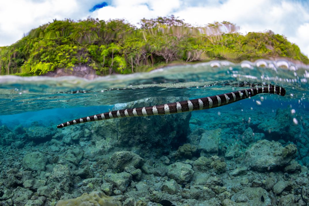 A highly venomous sea krait glides effortlessly through the crystal-clear shallows of Niue, one of the world’s smallest island nations and home to some of the most pristine reefs on Earth. Niue’s isolated location in the South Pacific, far from major population centers and industrial runoff, helps preserve its exceptionally healthy coral ecosystems—making encounters like this both rare and remarkable.