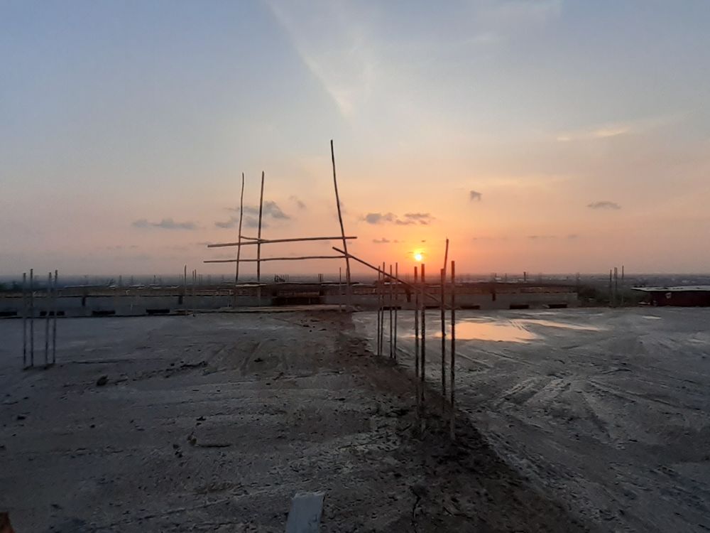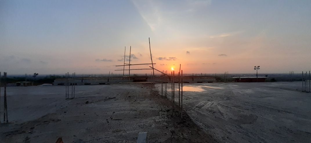 The skeletal framework of a new building stands silhouetted against the warm light of a West African sunset. The exposed rebar and vast, unfinished concrete floor represent the continuous process of development, contrasting the raw, industrial landscape with the serene beauty of the sky.