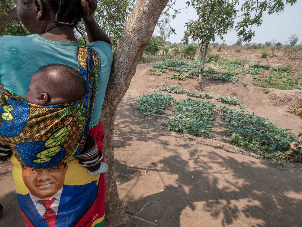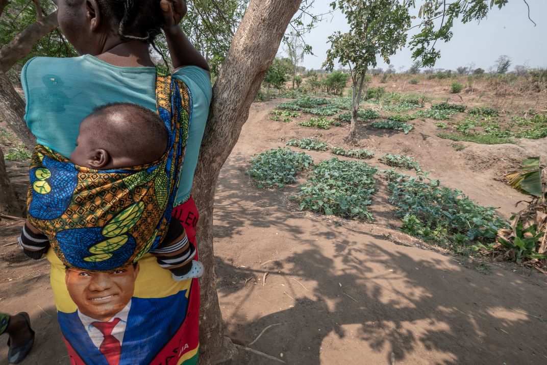 A Bisa woman from the Chitungulu community, one of the many indigenous peoples in Zambia, overlooking farmland with various vegetables. On her back she carry her baby and on her skirt a picture of Hakainde Hichilema, president of Zambia and ex-farmer himself. Today, the Bisa people faces several serious threats like drought from global warming. They often have conflicts with elephants, who come to their villages to eat their crops.