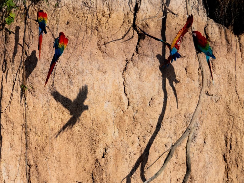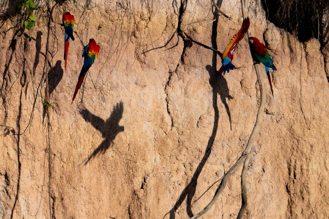 Scarlet Macaws (Ara macao), along with Red-and-Green Macaws (Ara chloropterus), gather on the clay cliffs of Tambopata Reserve in Peru. Their vivid feathers stand out against the earthy wall, while dramatic shadows cast by the rising birds add graphic depth to the scene. These macaws and parrots eat the mineral-rich clay to neutralize toxins from seeds and fruits in their diet, aiding digestion and providing vital electrolytes, especially sodium. The clay lick becomes a social arena and a visual spectacle, blending colorful wildlife with intricate plays of light and shadow in the Amazon.
