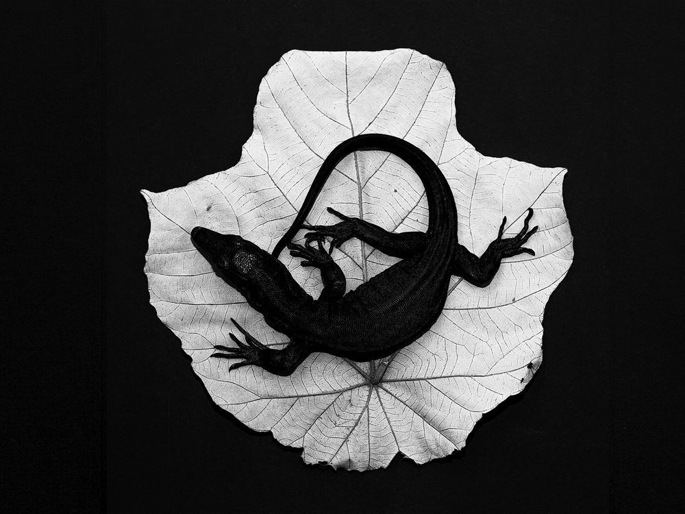 Shadowprint — a black-and-white image of a black monitor (lizard) perched on a leaf. Few details are visible — only the high contrast between the lizard and the leaf — giving the scene a dramatic, shadow-like imprint.