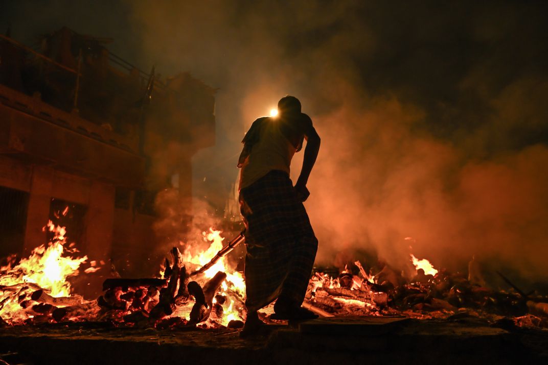 A silhouette of a worker tending to the eternal fires of Manikarnika Ghat. In the chaos of smoke and flame, the physical world seems to dissolve. For Hindus, to be cremated here is to break the cycle of life and death, achieving ultimate peace.