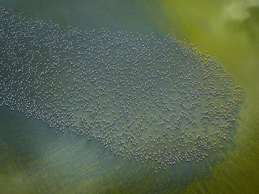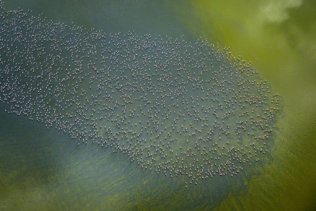 Photographed from a helicopter over Lake Magadi in Kenya, this high-shutter image reveals the quiet geometry created by thousands of lesser flamingos gathered in shallow water.