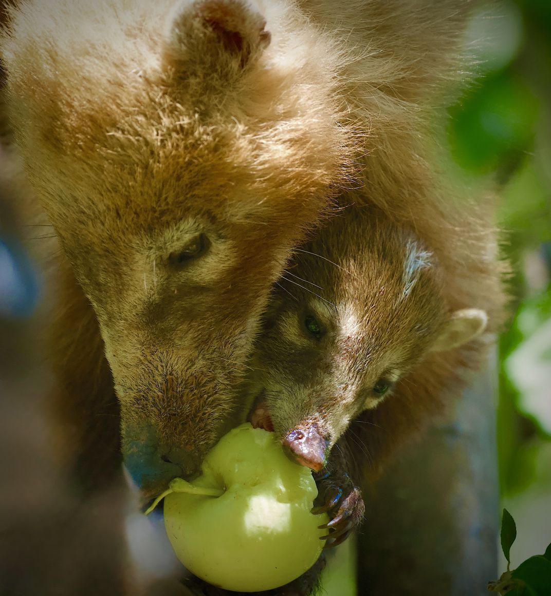 A mother and her baby Coatimundi share an apple from the orchard at Tonto Natural Bridge State Park in Pine, Arizona.