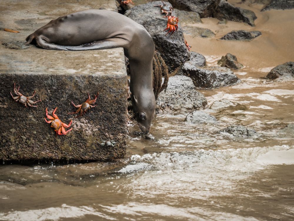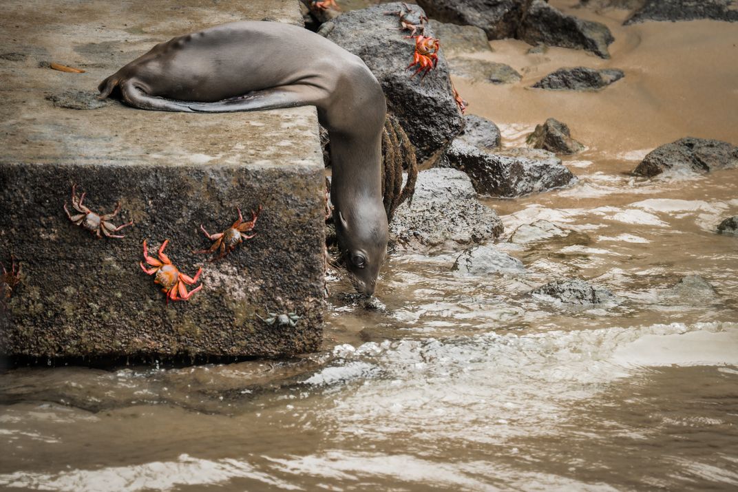 A young sea lion stretches over the pier to drink from the incoming tide, surrounded by bright Sally Lightfoot crabs. A simple everyday moment in the Galapagos, where wildlife and humans share the same edges of land and sea.