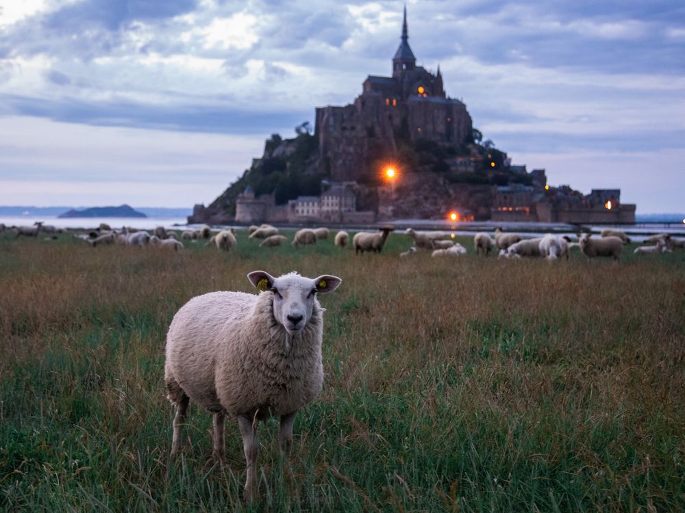 A sheep, one of the many who roam the grasslands that surround Mont Saint-Michel, gazes at the camera during twilight.