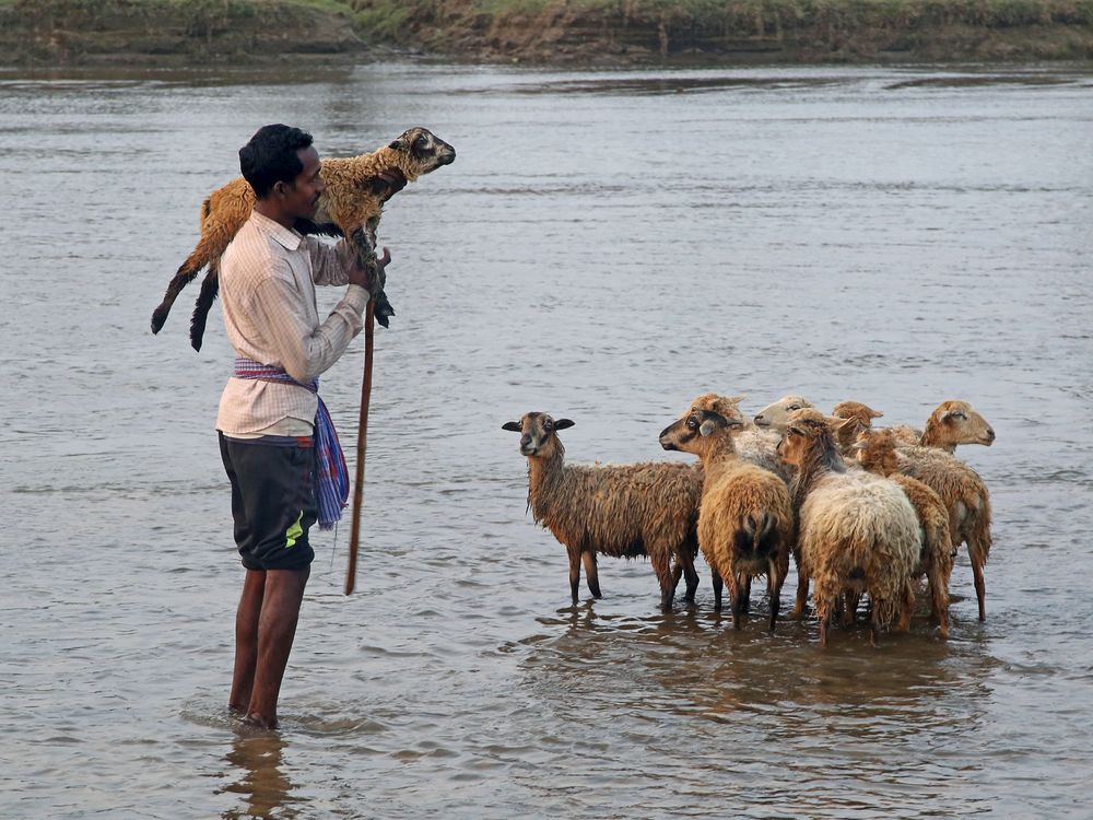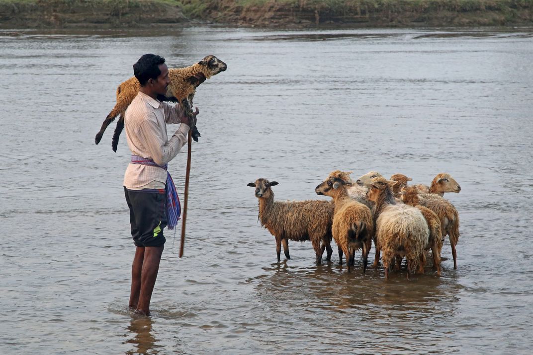 A village farmer is crossing the river with his pets and as the water is deep ahead the farmer then carries the lamb on his shoulders to protect it from getting wet. The pets then followed him.