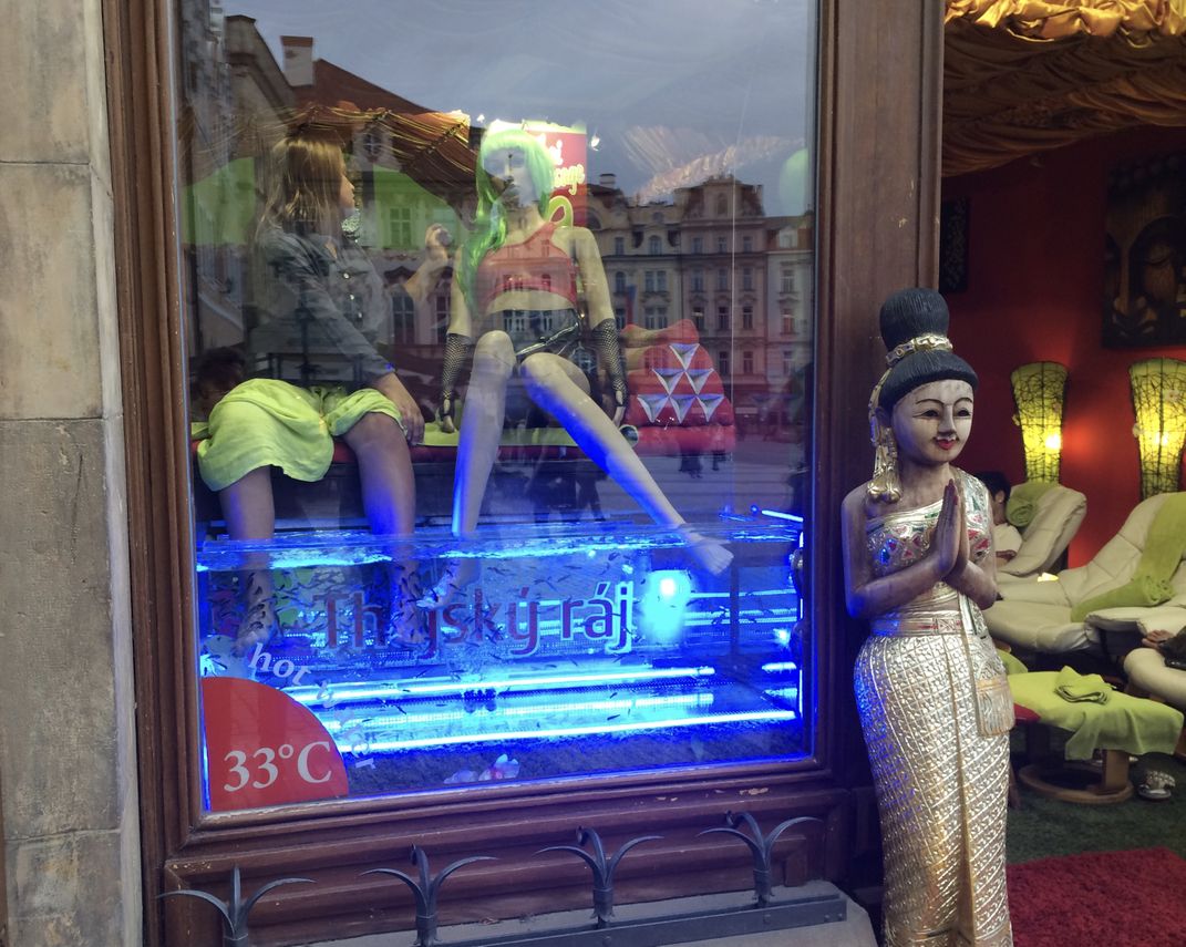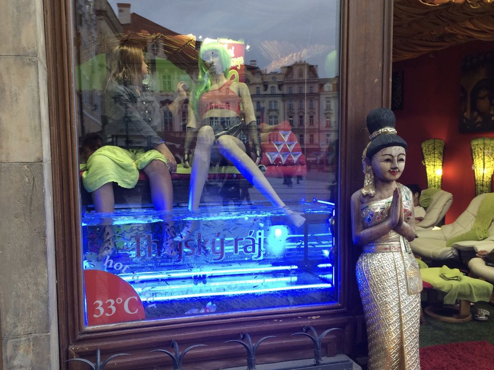 A young woman interacts with a mannequin as they both get a "fish pedicure" while sitting in a shop window on a central Prague street. A wooden mannequin with her hands in prayer stands watch.