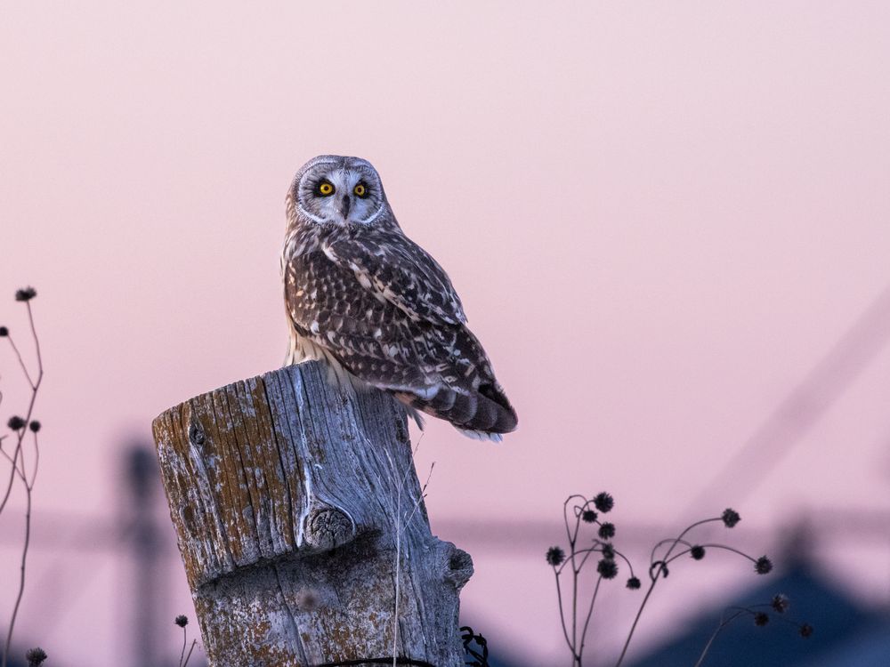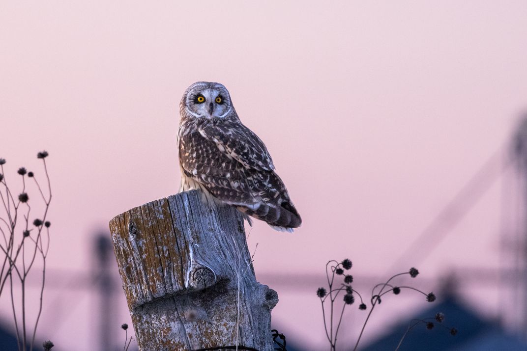 I was parked on a dirt road taking a photo of a harrier when this owl got up, barked at the harrier, and flew straight at me for an 1/8 of a mile. Then it perched on the post in the setting sun. It was very cold out, like, 5 degrees farenheit type cold. It is one of my favorite wildlife encounters ever.