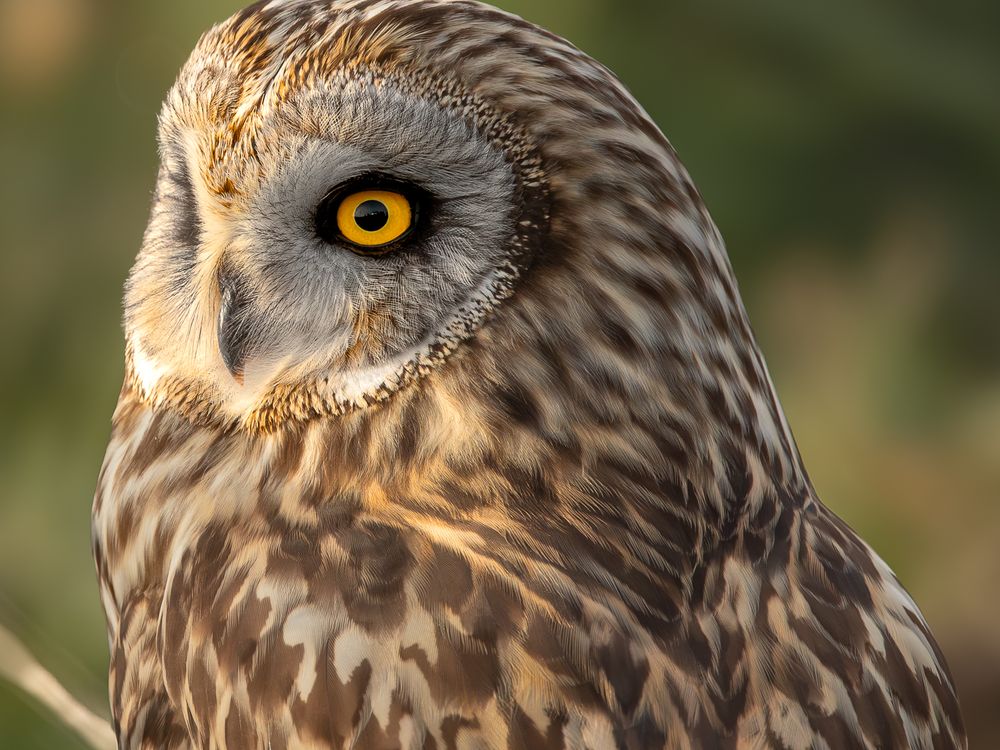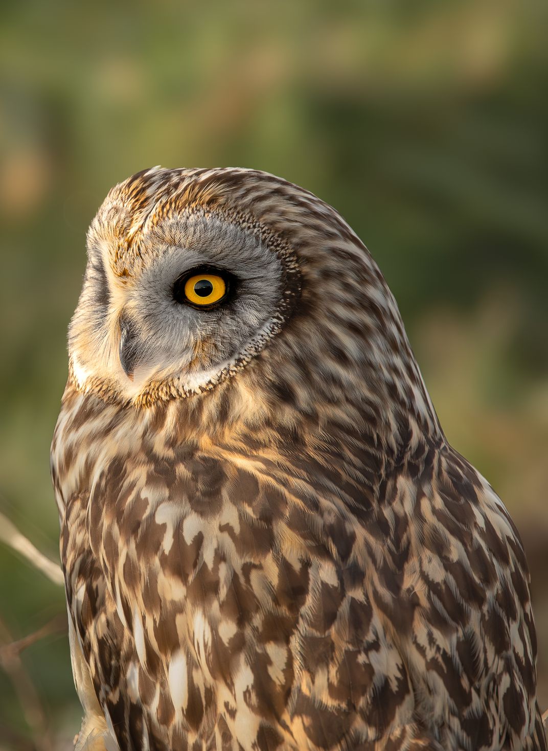 A short-eared owl sits by the edge of a grassy field catching the last rays of the evening sun.