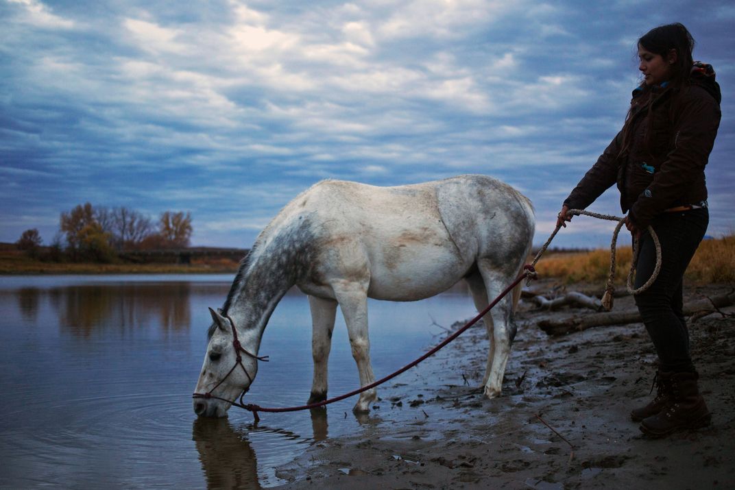 Jerica Meditz brings her new horse, Shota, to a stream so that he can have a drink of water at the Sacred Stone Camp in Cannon Ball, North Dakota. Jerica received the horse from the Standing Rock Horse Society after Shota was injured after being kicked by another horse.