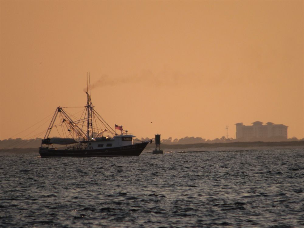 In Pensacola, Florida, shrimping is a major and historical industry. Boats go out in the evening and work all night, hauling brown shrimp in from Pensacola Bay and pink shrimp in from the waters of the Gulf. This boat was just starting its work off Santa Rosa Island.