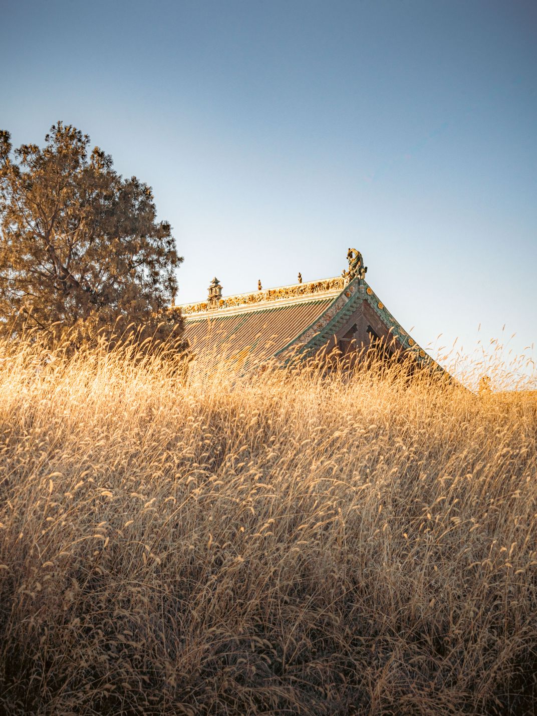 At Shuanglin Temple near the ancient city of Pingyao, a tiled roof with guardian figures rises just above a sea of winter reeds. In the last light of a January afternoon, the grasses and eaves catch the same golden glow, quietly linking the landscape to the old temple.