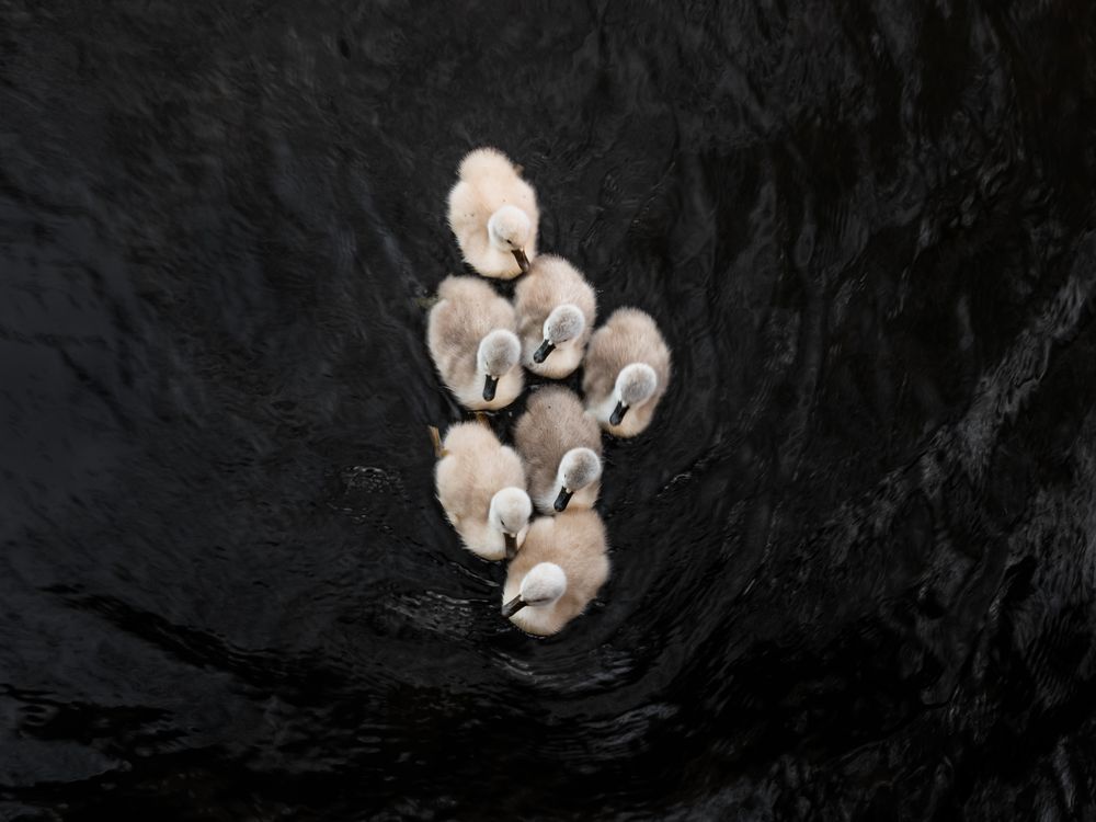 Every year I photograph Cygnets from a pair of nesting swans at a local pond. This year I had noticed them going back and forth under a wooden footbridge, knowing that they would come back I waited and captured this from the footbridge looking straight down