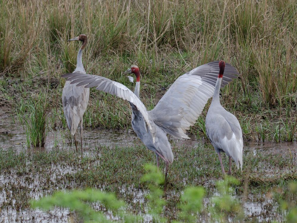 a sarus crane family at keoladeo national park feeding in day time at park ,suddenly one the crane spreads its wide wing span which looks like the park emblem