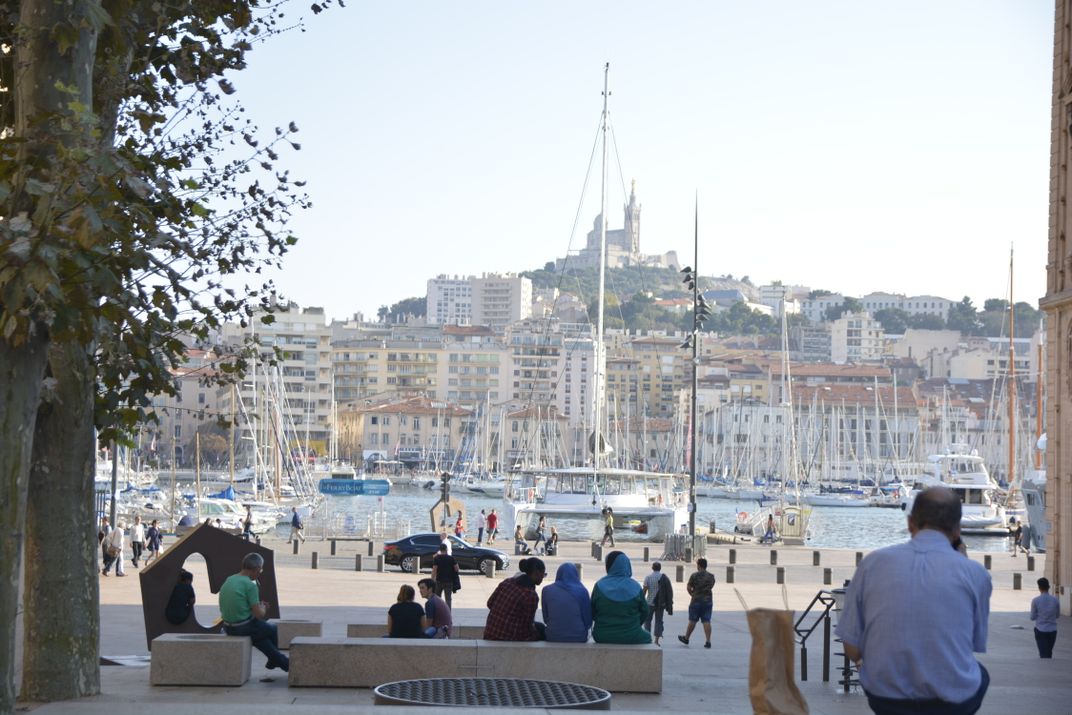 During the hot lunch time everyone was gathering into the shadows of the buildings near by docks .
