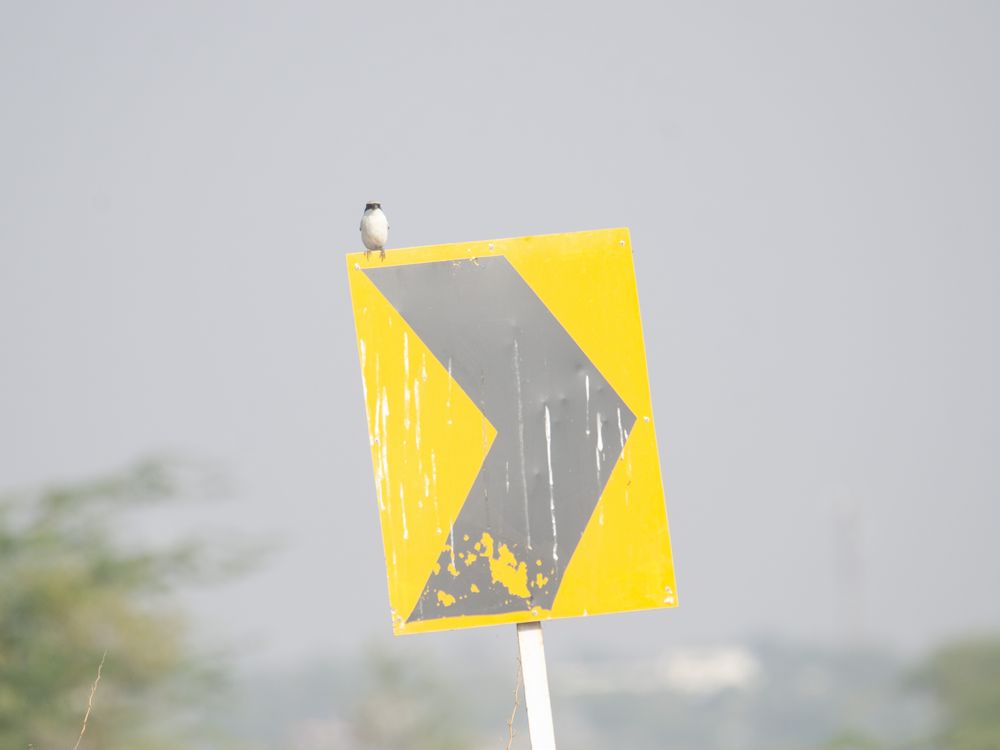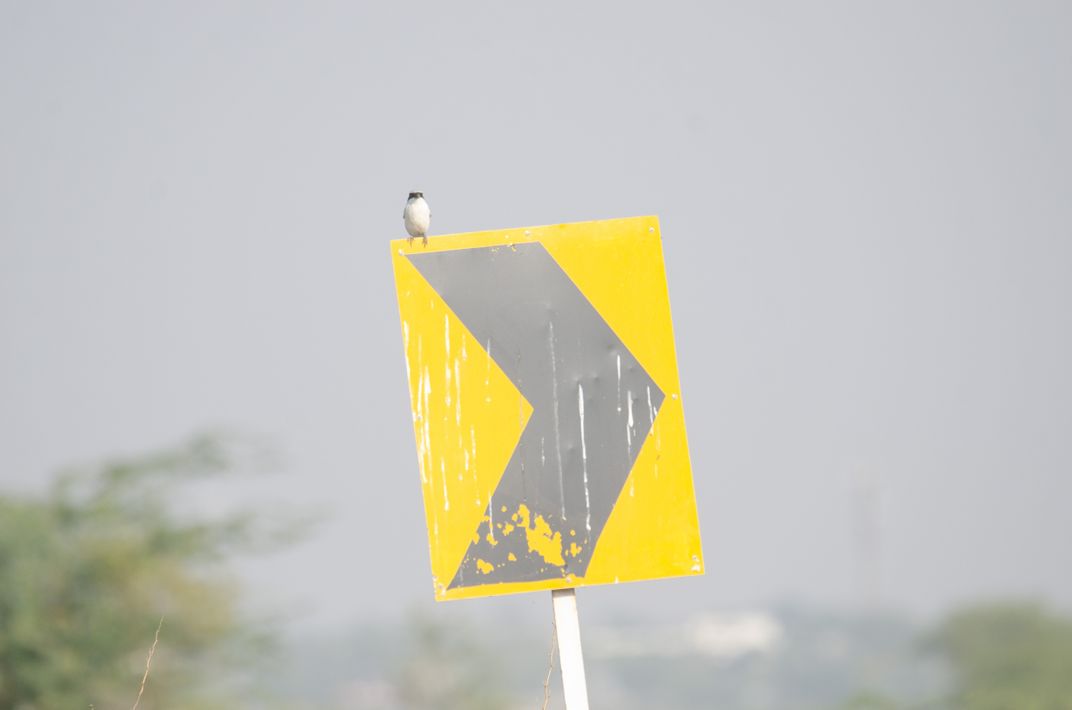 a grey shrike bird was sitting on top the roadside signal to keep right side.