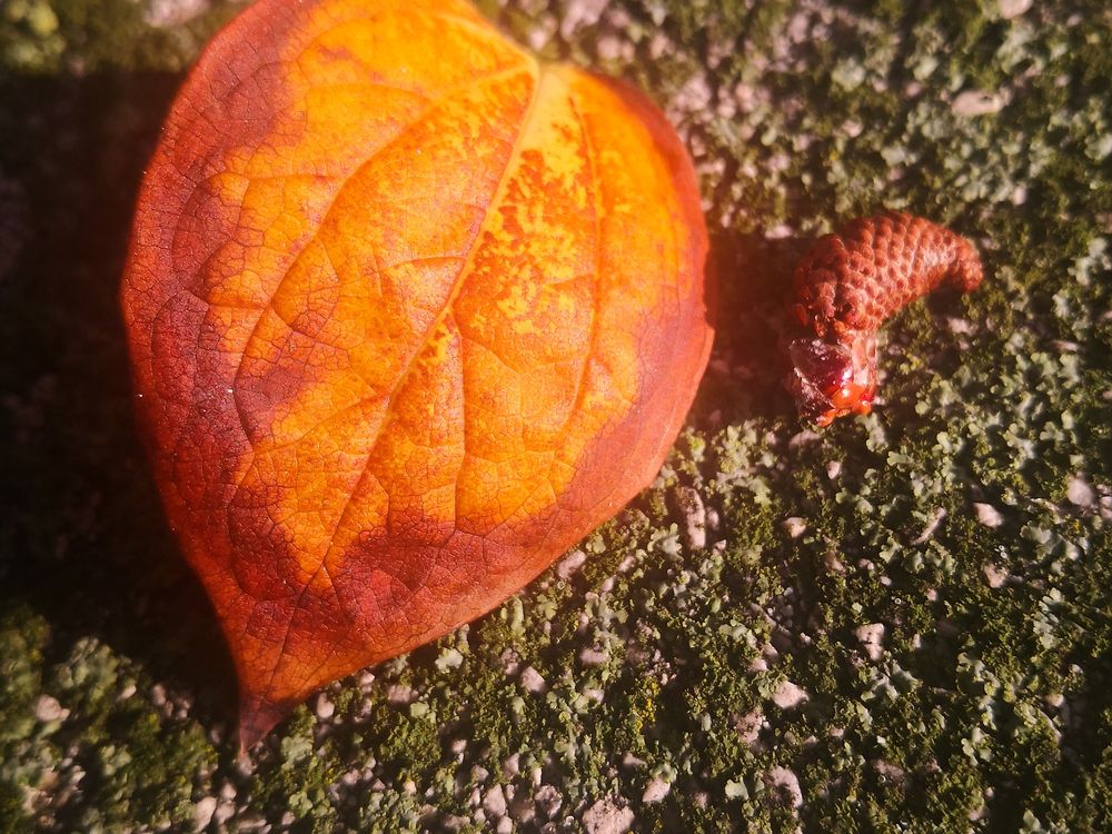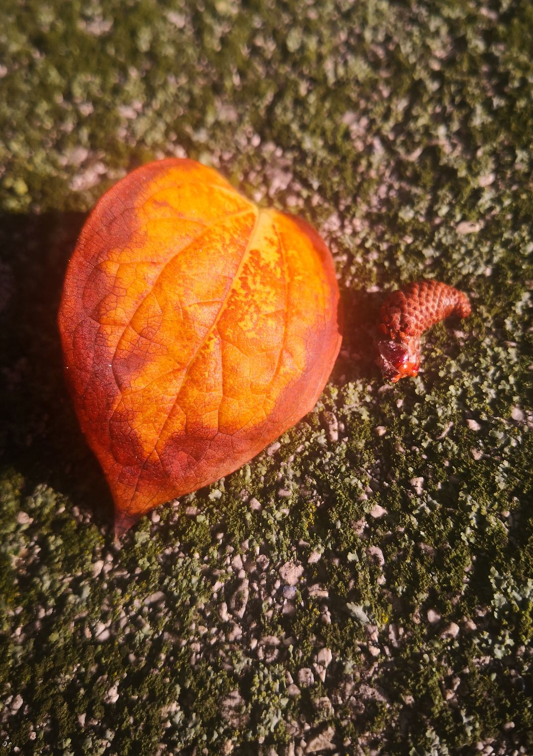An orange leaf resting on rough ground, glowing like a flame against the textured surface.