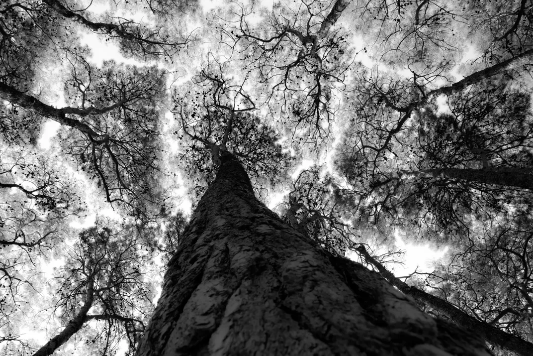 Looking up into the stark black-and-white labyrinth of branches. The texture of the trunk anchors this composition, forming a high-contrast puzzle against the brilliant sky. A beauty of pure nature