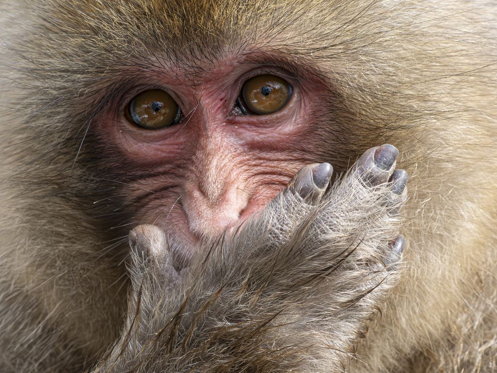 A Japanese macaque pauses with a hand raised to its face on a cold winter morning in Nagano, Japan. The moment highlights the fine texture of its fur and a natural behavior these primates use to protect exposed skin in freezing conditions.