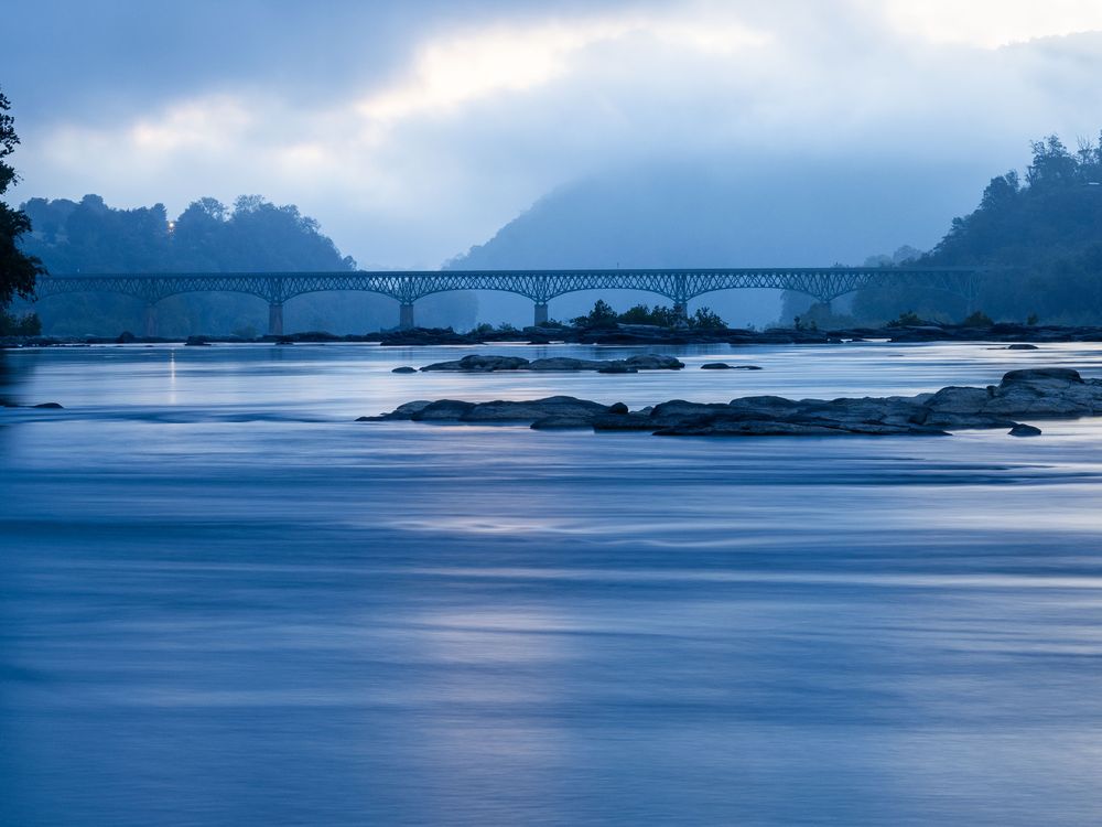 First light glows through the fog over the Potomac River in Harpers Ferry, framing the historic bridge in a tranquil sunrise scene.