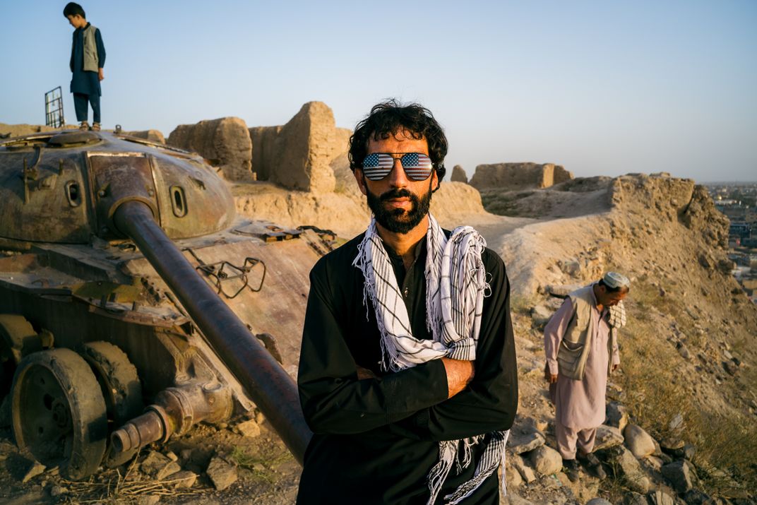 "Leaning against the gun of a tank now defeated by time and rust, this man poses with the calm of one who has seen history change many times. His glasses, decorated with the American flag, reflect a paradox in the country's history: a fragment of the West in the heart of Afghanistan. There is no provocation or irony in his gaze, only the calm and silence of someone who lives daily among the ruins of the past and imported symbols. Behind him, a child plays on what was once war, while a passerby leaves it behind. He, however, remains impassive. "