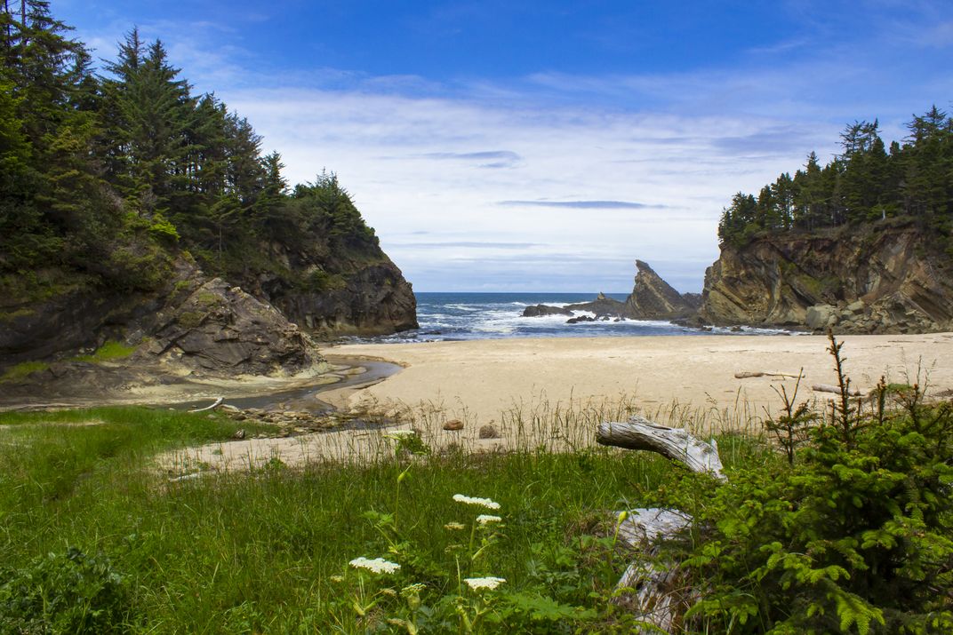 A bright, sunny summer day at Simpson Beach located just below Shore Acres Botanical Gardens in Coos Bay, Oregon. This was once a private beach on a large, rich property which is now shared as a local and tourism treat in this sleepy little coastal town. Simpson Beach is surrounded by cliffs and thick forests full of hiking for the adventurous! I love the way the grass leads to the sand which leads to the sea... It is a truly unique beach.