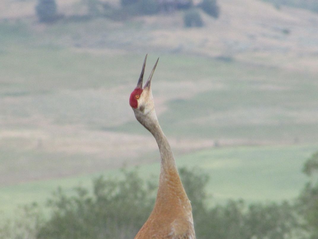 Sand Hill Cranes make their home on the -N- Ranch in Belgrade, MT, on the base of the Bridgers. This one lifts his head in song!