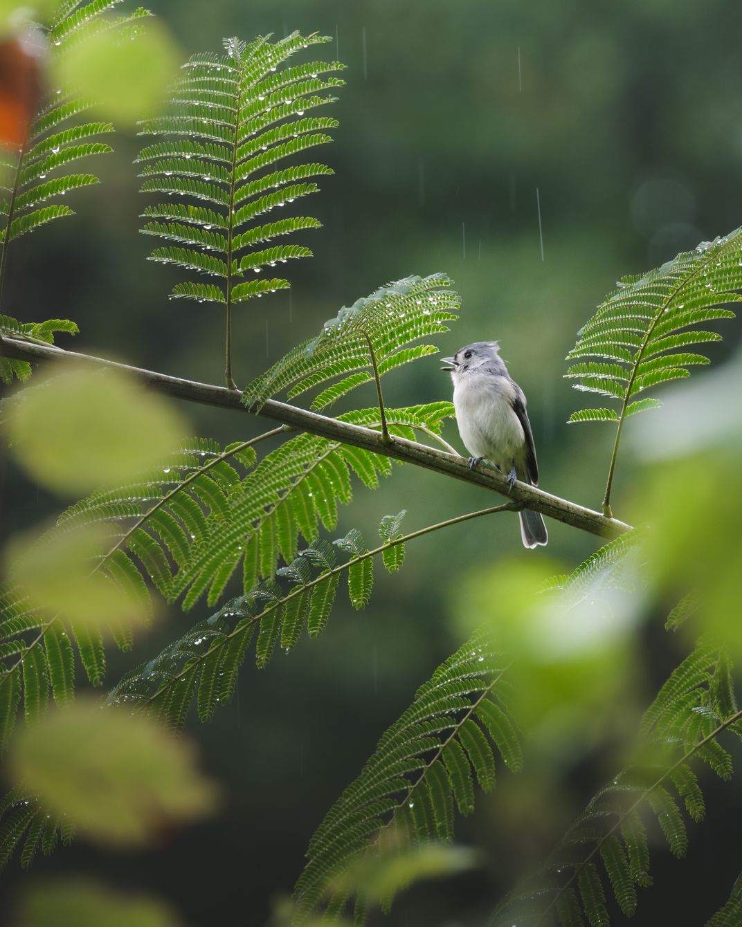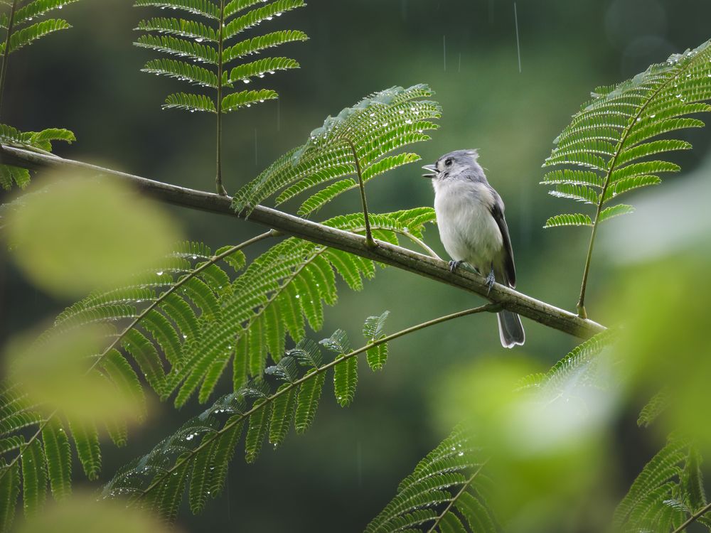 Tufted Titmouse singing in a field during a light rain shower.