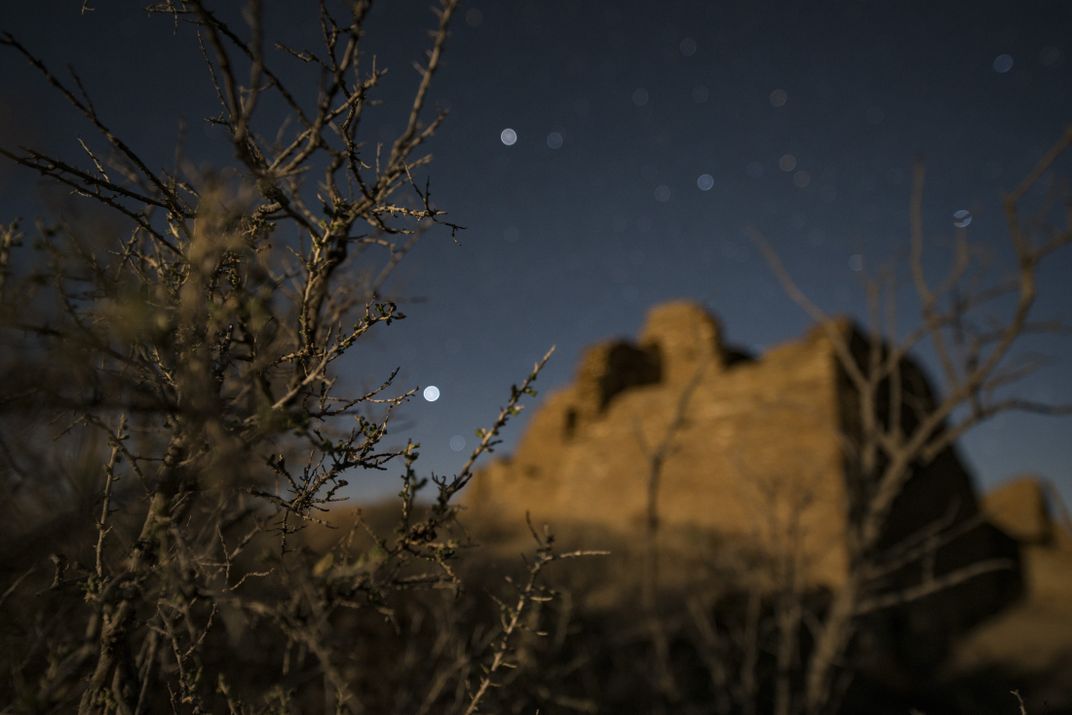 Focusing on branches of a plant creates an impressionistic look to the ancient site of Pueblo del Arroyo at Chaco Culture National Historical Park in New Mexico and the bright setting star Sirius.