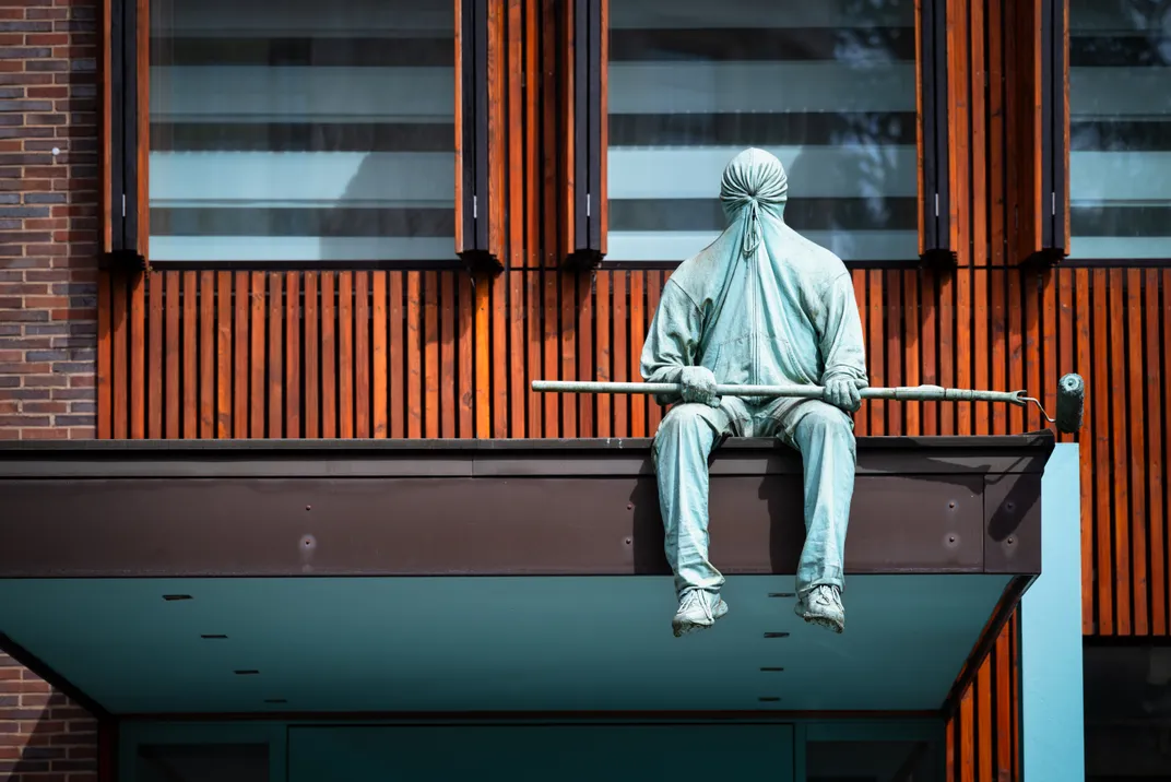 This shot was taken during a photowalk in Wuppertal, Germany. The sitting sculpture is part of an office building.