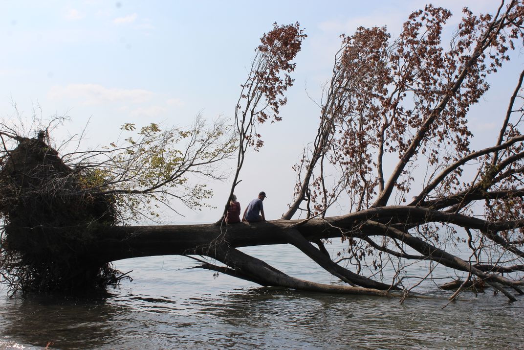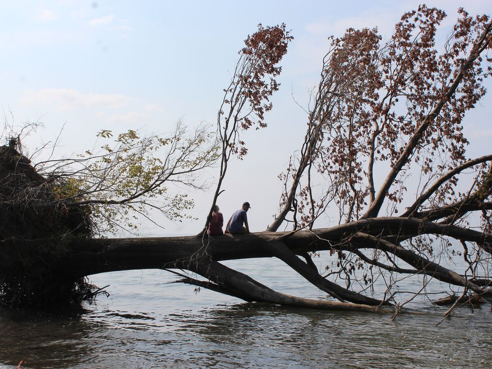 The photo is showing two people sitting on a tree by the shores of Lake Erie. The tree has toppled over into the lake but surprisingly still alive.
