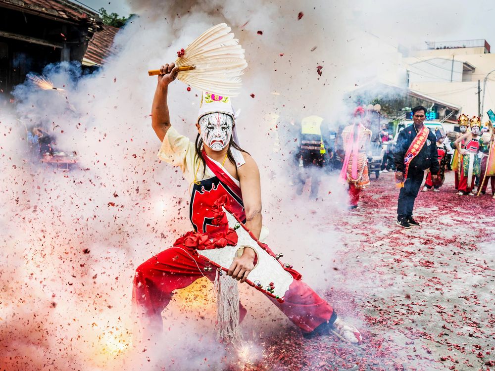 The temple lively celebration,is the most representative of Taiwan's traditional culture. Face painting symbolizes the gods, when God possessed person, they are not afraid of firecrackers. Which is Taiwan's art, like real divinity.